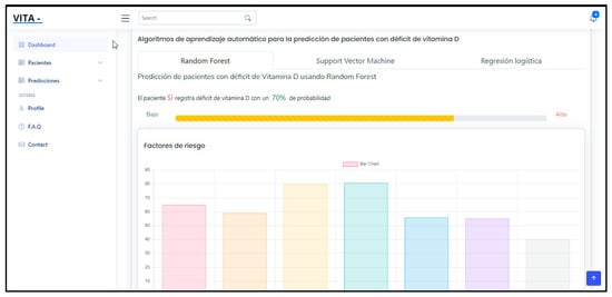 Thus, according to the previously mentioned research, an enormous amount of clinical data is collected daily in the medical field to study hypovitaminosis D; processing these large datasets presents a manual challenge with traditional approaches such as Linear Regression models. Thus, the main objectives of this research are as follows: (i) Create a secure private database with sociodemographic and clinical information about vitamin D levels. (ii) Identify the main variables associated with vitamin D deficiency levels and several risk factors. (iii) Evaluate the performance of the most effective ML models in vitamin D prediction deficiency levels based on statistical metrics. (iv) Develop an intuitive web GUI tool that lets users predict and diagnose vitamin D deficiency levels in real time. The application includes three main modules and functionalities: patients (general information, habits, patient history), predictions (uses machine learning algorithms to estimate the risk of vitamin D deficiency, graphs to visualize risk probability, risk factors analyzed using bars and progress), and system.