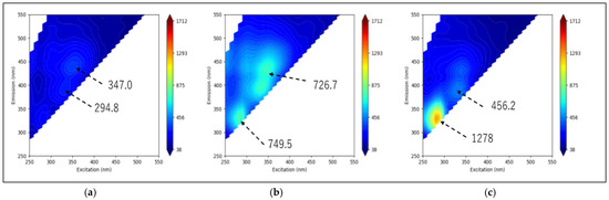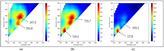 A fluorescence spectrophotometer (F-7100; Hitachi High-Tech Science, Ibaraki, Japan) was used to measure the fluorescence properties of the samples. The excitation and fluorescence wavelength ranges were both 250–550 nm, the ex-citation sampling interval was 10.0 nm, and the fluorescence sampling interval was 5.0 nm. The excitation and emission wavelengths were selected in the range of 250–550 nm so that they did not overlap, as shown in Figure 1 and Figure 2.