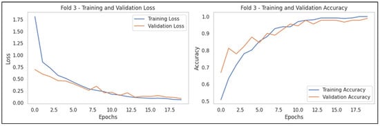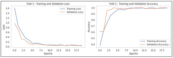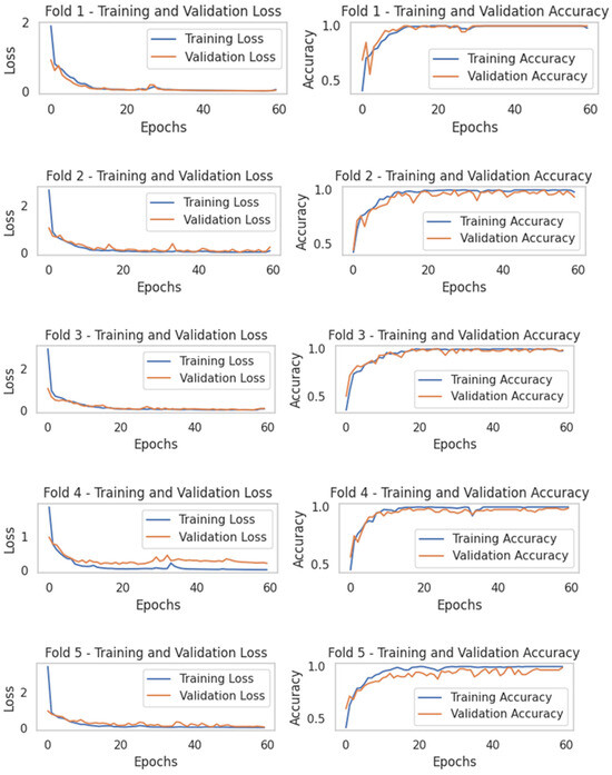 Analysis of the learning curve showed that the difference between the training and validation losses was small, and no signs of overfitting were noticed. Accuracy approached 1 as the number of epochs increased, and the overall performance of the model was evaluated to be considerable (Figure 5). Furthermore, the validation accuracy of each fold was stable and high. Therefore, the model performed consistently across the entire dataset. By contrast, the model converged very early, suggesting that the learning rate was high or that the initial weights were affected. In addition, the validation loss temporarily increased in the middle of some folds (Fold 4), suggesting temporary instability of the model.