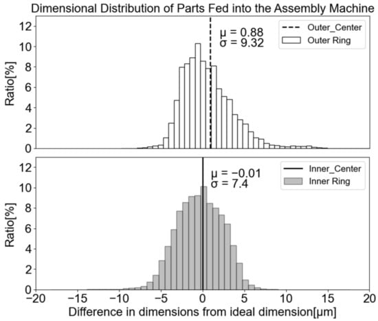(2) The matching algorithm method employed for component selection. In conventional approaches, the algorithm selects the combination of components that results in the assembly tolerance Y that is closest to the design tolerance value. Although this method ensures the best quality by considering all possible combinations, it potentially increases the number of surplus parts in the slots. Figure 4 shows the dimensional distributions of the outer and inner rings introduced into the assembler over the same length of a production cycle. Both distributions exhibit a near-normal distribution centered around their respective mean values. In an optimal scenario, components with dimensions near the center of their distribution are matched with each other, whereas components with large deviations are paired together.