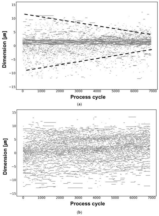 (a) Dimensional distribution in slots vs. process cycle in the ordinary case. (b) Dimensional distribution in slots vs. process cycle in the optimal case.