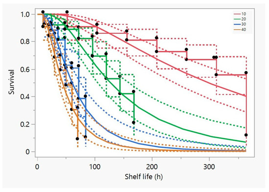 Survival time (h) at different temperature levels using the Kaplan–Meier estimator.