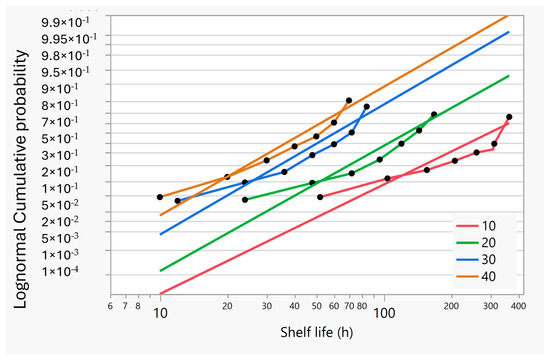 Although the study points were not scattered equally on either side of the regression lines at all temperature levels (Figure 2), the estimates of the average shelf life in the table of parameters of the lognormal distribution yielded comparatively reliable results. In particular, the lognormal values of the survival times (h) were very close to those of the exponential model and thus indicated a second reliable model for fitting and predicting the sensory shelf-life data (Table 9).