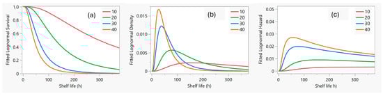 Fitted distributions of the analytical characteristics of survival time using lognormal transformation at each temperature level (a) survival curves as a function of shelf life (h), (b) density curves as a function of shelf life (h), (c) hazard curves as a function of shelf life (h).