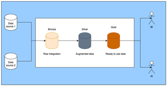 Data preparation has been designed with the use of the medallion approach (it is a design of preparing data from the data engineering domain; see Figure 3), which allowed us to create a clean structure of the whole experiment.