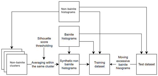 In contrast to the previous method, where excessive bainitic observations were pruned, this approach aims to retain them in the dataset by moving them from the test set to the training set to achieve equal class proportions in the test set. Synthetic non-bainitic segments were then generated using the k-means++ algorithm to cluster a subset of the training set consisting only of non-bainitic-like histograms. Different numbers of clusters (2–11) were tested to find the optimal configuration. The quality of each clustering is assessed by calculating the silhouette score, which measures how well the clusters are separated. The best number of clusters was selected based on the highest average silhouette score. Once optimal clusters were identified, the function generated new data by averaging histograms belonging to the same cluster and creating a desired, user-defined silhouette score. This approach ensured equal proportions in both the test and training sets, while maintaining control over the quality of the generated data through the application of a threshold to the silhouette for each data point (See Figure 4).