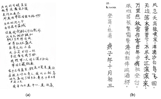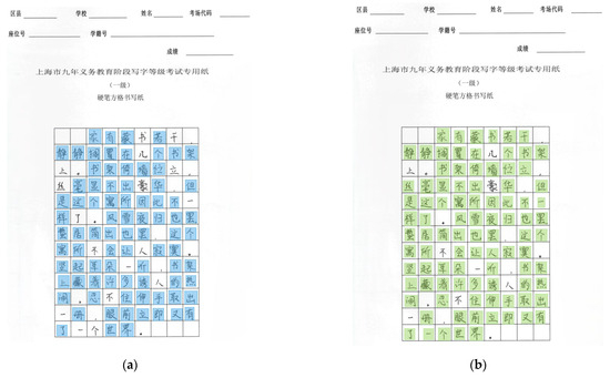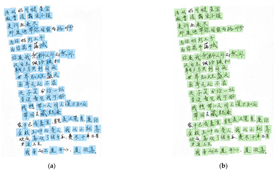 The dataset was constructed in the context of the writing grade examination for primary and secondary school students in Shanghai, 240 students who were about to take the writing grade examination were invited and their handwritten images of Chinese characters were collected as the research samples. The dataset covers different writing scenarios: first, formal writing on exam-specific papers, and second, unconstrained daily writing practice. To fully represent the differences between these two writing environments, 480 high-quality images of handwritten Chinese characters were collected, covering more than 40,000 Chinese characters and presenting rich background variations and diverse writing styles. This dataset aims to simulate the actual differences between the test scenarios and daily writing and to better meet the needs of handwritten Chinese character detection in writing grade tests. All samples are dense text images containing a large number of Chinese characters. Figure 4a,b show the partial writing grade exam dataset constructed in this paper, while Figure 5a,b present the corresponding unconstrained text dataset, respectively.