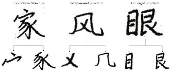 In addition, to improve the capability of the Chinese character detection model in recognizing diverse structural components of Chinese characters, this paper further integrates a set of image datasets designed specifically for the task of Chinese character component segmentation. The dataset covers a variety of different structures of Chinese character components, including left-right structure, top-bottom structure, wraparound structure, etc., to cope with the diversity of Chinese character component morphology as well as the complexity of the background. Figure 6 shows the diagram of some Chinese character components.