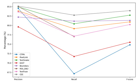 CTPN is a single-stage model for text detection, which has significant advantages in dealing with oblique and curved text. PixelLink is a pixel-level-based text detection model, particularly suitable for scene text detection and text regions with great morphological variations. TextSnake is particularly good at dealing with curved and bent text. This study focuses on the segmentation task of Chinese character detection, which usually involves multi-scale target detection, complex background processing, and accurate localization of small targets, so these three models that are good at handling complex text are targeted to be chosen as comparison objects to evaluate the performance of CEE networks in Chinese character detection. The results are shown in Table 3. Boundary is An end-to-end framework utilizing multi-scale boundary point localization and adaptive topology reconstruction to boost accuracy in detecting/recognizing irregularly shaped text within complex scenes, R50_DBU represents a sophisticated segmentation-driven network incorporating U-Net architecture, TextFuse integrates hierarchical feature synthesis with cross-detector consensus mechanisms to resolve single-modality constraints in scene text analysis.