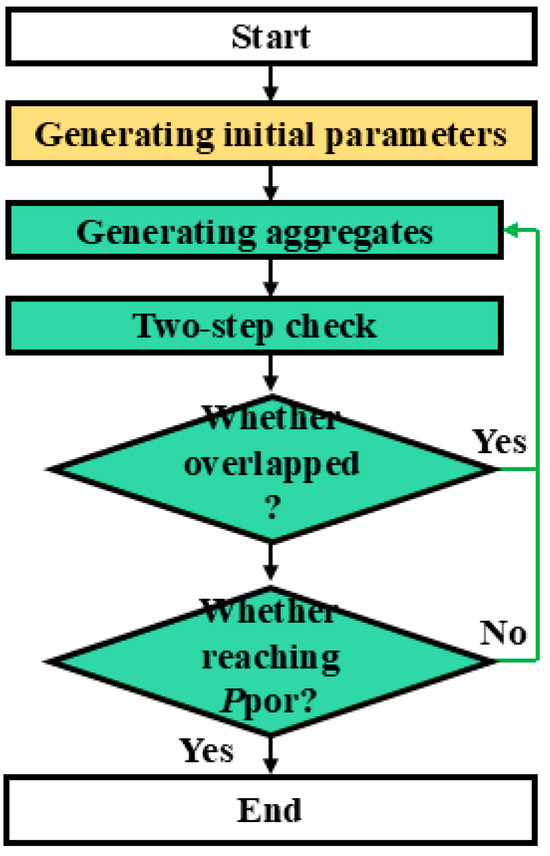 Therefore, according to the above steps, the generation process of random pores inside the rock mass within the SPH framework can be obtained, as shown in Figure 1. It mainly includes generating initial parameters, generating pore parameters, checking for overlap between pores, and judging whether the target pore percentage has been reached.