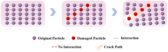 To characterize the failure process of the particle, a fracture marker ω is introduced in this section to improve the traditional smooth kernel function W. For the fracture marker w, it is defined as follows: when the maximum principal stress σ1 on the particle is greater than its tensile strength σt, w = 0, and the particle fails at this time; when the maximum principal stress σ1 on the particle is less than its tensile strength σt, w = 1, and the particle has not failed at this time. The failure treatment process is shown in Figure 2. The improved smooth kernel function is denoted as K, and its relationship with the traditional smooth kernel function W can be expressed as follows [51]: