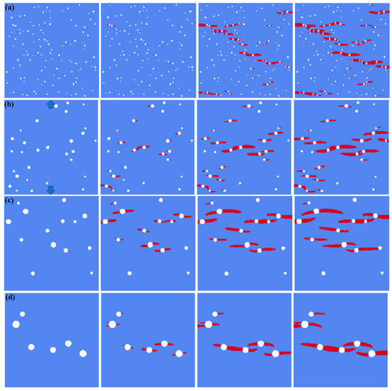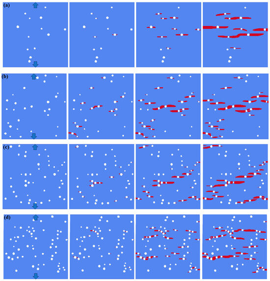 Uniaxial tensile crack propagation process of the rock model under different pore sizes. (a) (dmin, dmax) = (0.0005, 0.001) m; (b) (dmin, dmax) = (0.001, 0.002) m; (c) (dmin, dmax) = (0.0015, 0.003) m; (d) (dmin, dmax) = (0.002, 0.004) m.