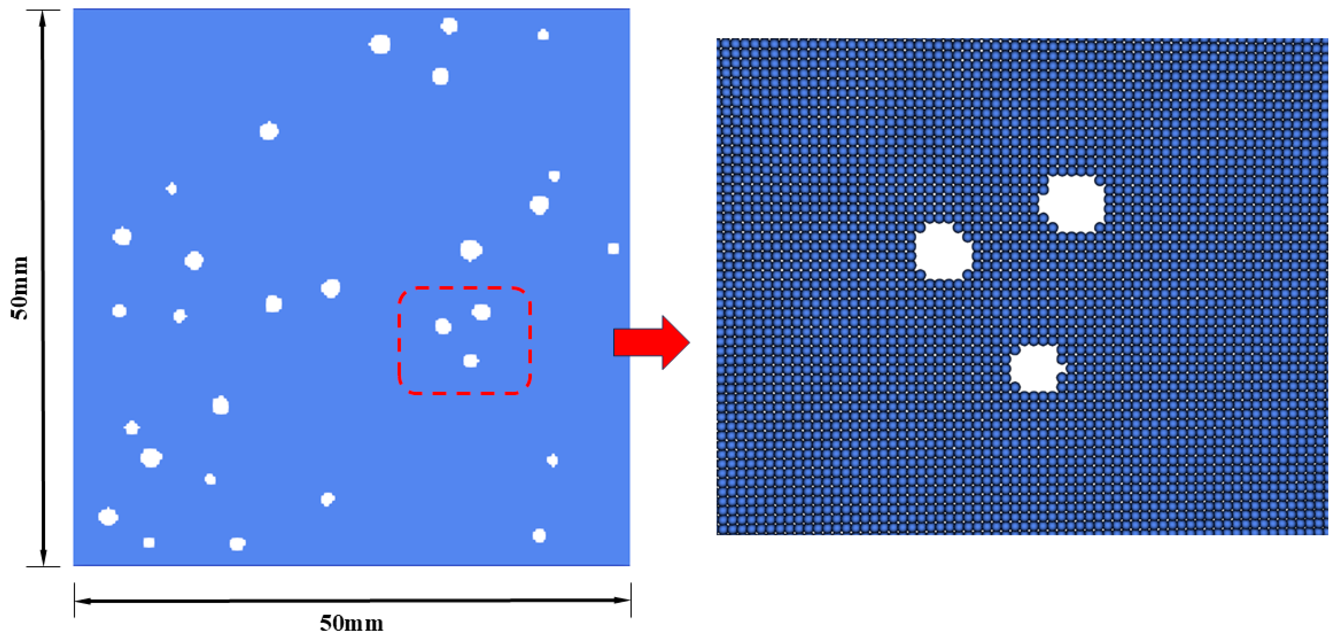 There are a large number of pores inside the rock, and the reasons for their formation are as follows: (1) physical weathering, such as temperature changes causing differences in expansion and contraction between the surface and the interior of the rock to form fissures and then pores, and the freeze–thaw action expanding the rock pores when water freezes to form holes; (2) chemical weathering, such as the dissolution of rocks such as limestone leaving holes due to the dissolution effect, and the oxidation effect changing the mineral structure of the rock to produce holes; (3) biological action: the mechanical pressure of plant root growth enlarges the rock fissures to form holes, and the excavation of animals and the decomposition of rocks by substances secreted by microorganisms also cause holes. Pores have a significant impact on the mechanical properties of rocks. They will reduce the strength of the rock. The existence of pores weakens the internal connection of the rock, making it more likely to be damaged under external forces. They also reduce the elastic modulus of the rock, change the deformation characteristics of the rock, and make it more likely to produce large deformations when subjected to force. At the same time, they increase the permeability of the rock. The interconnected pores form channels, making it easier for fluids to flow in the rock. Therefore, it is necessary to consider concrete pores in numerical simulation.