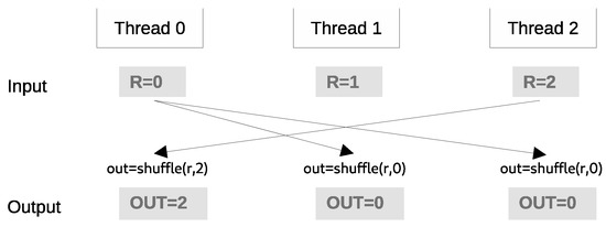To overcome this limitation, BACQ introduces a virtual caching layer for threads within a warp by leveraging registers instead of relying solely on thread-block shared memory. Starting with the Kepler microarchitecture in 2012, CUDA introduced the shuffle instruction, enabling communication between threads within a warp using the thread’s registers. The shuffle primitive, , allows a calling thread to read the register value r from another thread t within the same warp. Figure 7 illustrates how the shuffle function works: Thread 1 and Thread 2 can access values from Thread 0’s register, while Thread 0 reads the value from Thread 2’s register.