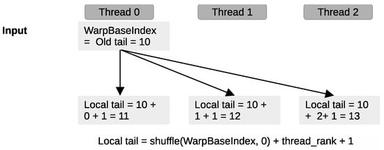 BACQ utilizes this technique to compute the current tail and head positions locally without needing to access the global tail constantly and head counters. The leader thread uses the shuffle primitive to broadcast its old tail and head counters to all active threads in the warp. Each thread then adds its thread rank to the old tail or head value. Since thread ranks increase sequentially starting from 0, we add an extra 1 when calculating the tail position as shown in (Figure 8):