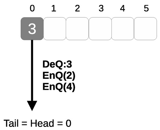 - No boundary condition risks: Because enqueues and dequeues are paired and adjacent, each dequeue always has an item. Enqueues cannot provoke a queue full boundary because a dequeue immediately follows each enqueue, keeping the queue from filling.
