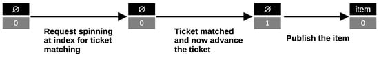 For each index in the queue, our strategy attempts to match the ticket associated with the operation before proceeding; if there is no match, we wait until it becomes available. If an enqueue operation arrives early, we attach a ticket calculated as , and the next dequeue operation, the ticket is . After employing the ticketing mechanism: