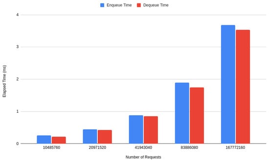 In our experiment, we measured the elapsed time for both enqueue-only and dequeue-only scenarios to understand any differences in their execution times. Figure 14 illustrates that regardless of the number of requests, both the enqueue and dequeue methods exhibit similar performance characteristics. This observation suggests that once the order is established, neither operation significantly outpaces the other.