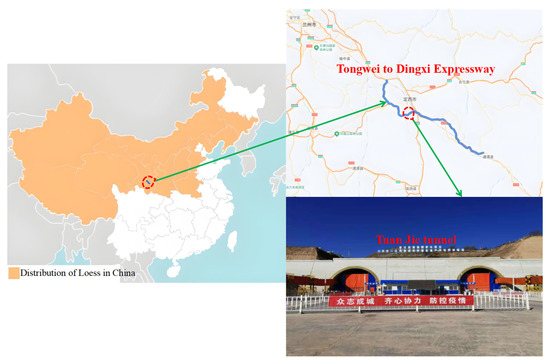 The key tunnel projects of the Tongwei-Dingxi Expressway mainly include the Jinping Tunnel, Mayingxia Tunnel, Huajialing Tunnel, and Tuanjie Tunnel. Among them, the Jinping Tunnel, Tuanjie Tunnel, and Baijiachuan Tunnel all traverse shallow-buried water-rich strata, presenting extremely complex geological conditions. In particular, the entrance and exit strata of the Tuanjie Tunnel have high water content and poor stability of the surrounding rock, making it highly prone to engineering issues such as water seepage, slope cracking, and collapse of the arch crown and sidewalls. Figure 1 is a schematic diagram showing the location of the Tuanjie Tunnel.