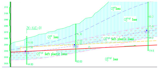 The Tuanjie Tunnel is located in the loess ridge area and is a long, large-scale loess tunnel with separate left and right tunnels. It is currently known as the loess tunnel with the highest proportion of VI-grade surrounding rock in China, with VI-grade surrounding rock accounting for 49.8% and V-grade surrounding rock accounting for 50.2%. The tunnel traverses mainly through the Upper Pleistocene loess strata, with aeolian loess (Q3eol) in the upper part and alluvial-proluvial loess (Q3al+pl) in the lower part. The entrance and exit sections of the tunnel pass through soft plastic intercalations. The groundwater level is within the design elevation of 20.0 m and is locally 25.0~40.0 m above the tunnel roof. The surrounding rock in the tunnel section is plastic to soft plastic loess. The tunnel is shallowly buried and water-rich, with large deformations and high susceptibility to collapse in the surrounding rock. It is highly prone to stripping and deformation after excavation, posing high construction risks and technical challenges. It serves as the pilot test section for tunnel construction in water-rich strata along the entire route. Figure 2 is the longitudinal geological profile of the left entrance of the tunnel using the Leading Software.