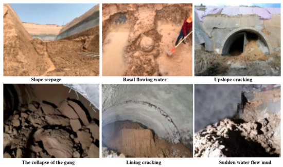 Since the project started in May 2019, due to the influence of groundwater, atmospheric precipitation, fissure water, etc., the moisture content of the surrounding rock has been as high as 29% or more, far exceeding the liquid limit value. During tunnel construction, the surrounding rock at the tunnel face often experiences a transition from plastic soil to water seepage to flowing water. Water immersion causes instability in the base, resulting in various engineering disasters such as deformation of the primary support and collapse of the tunnel face. There have been 2 major deformations, 10 m of arch replacement, 13 m of slope cracking treatment, and over 20 collapses. In order to overcome the challenges of natural water abundance and excavation disturbance in tunnels, a scientific research project was initiated in August 2019 to make scientific decisions on the stability of surrounding rock, causes of disasters, and engineering disposal measures. Figure 3 shows a series of engineering disasters encountered during the construction of the Tuanjie Tunnel, including slope cracking, base water seepage, tunnel face collapse, and cracking and subsidence of the primary support.
