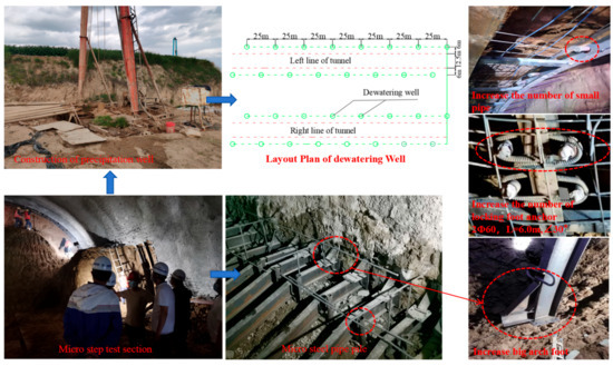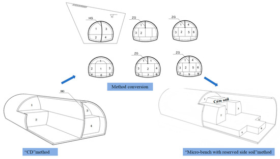 Based on the results of regional engineering analogy analysis and the index weights of various influencing factors in the fuzzy evaluation decision-making index layer for the stability of surrounding rock in water-rich loess tunnels, it was determined that naturally water-rich formations and water-rich formations caused by disturbance were the primary factors leading to instability of the surrounding rock. Through scientific decision-making, comprehensive measures were implemented on top of the original excavation and support design. These measures included well-point dewatering at the tunnel crown, densifying advanced small pipes, increasing the number of locking anchor pipes, adding longitudinal support beams at the arch feet, incorporating larger arch feet, and enhancing the reserved deformation. Additionally, an experimental construction was conducted to transition from the “CD” (Center Diaphragm) method to the “Micro-bench with reserved side soil” method. Field monitoring was also conducted to assess the scientificity and effectiveness of these comprehensive measures. Figure 4 provides an overview of the comprehensive response measures. Figure 5 is a schematic diagram of the construction method transition in the experimental section.