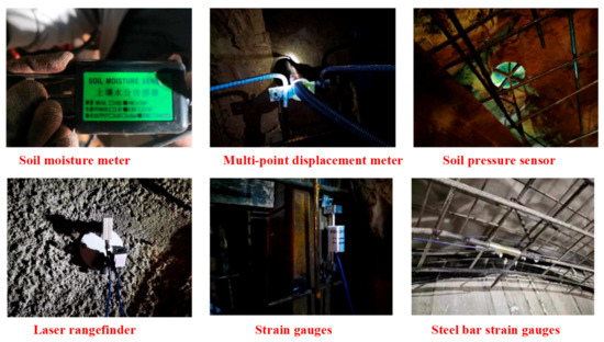 To verify the effectiveness and rationality of the construction measures and accumulate regional engineering experience, on-site measurements were conducted on the mechanical behavior patterns of the surrounding rock and support, including the moisture content of the surrounding rock, convergence deformation of the surrounding rock, contact pressure between the surrounding rock and support, and the stress characteristics of the composite lining support structure during the construction process of the tunnel passing through the soft-plastic to hard-plastic loess strata. The left line of the tunnel entrance test section (ZK81+445, ZK81+460) was selected as the monitoring section, with a tunnel depth of 55–65 m. According to the purpose and content of the monitoring and measurement, the detailed layout of sensors at each measurement point on the monitoring section is shown in Figure 6, and the on-site installation images of the sensors are presented in Figure 7.