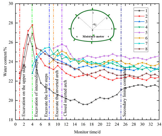Due to the tunnel passing through soft-plastic strata, a construction plan was adopted where deep hole precipitation was carried out on the surface before excavation. After excavation, changes in the moisture content of the surrounding rock were influenced by the excavation process, and there is a certain correlation between them. Figure 8 shows the variation curves of the moisture content at each measurement point on the monitoring section with monitoring time and excavation space.