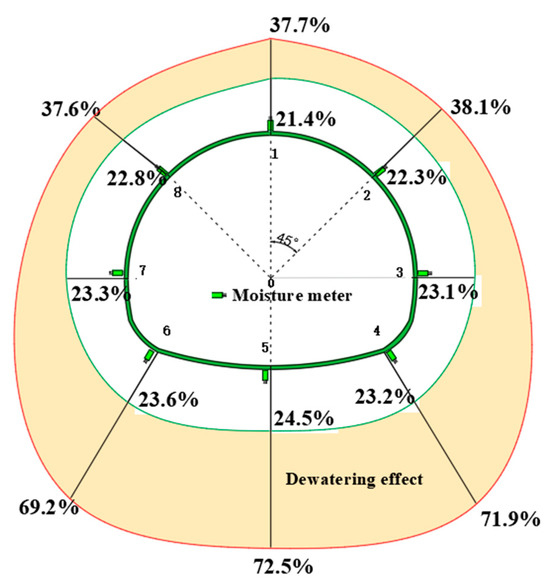 The distribution pattern of moisture content in the surrounding rock after stabilization is shown in Figure 9. The variation pattern of moisture content in the surrounding rock with monitoring time and excavation space in the monitoring section indicates the following: The moisture content of the surrounding rock at the vault and arch waist exhibits a four-stage change characteristic: linear increase → sharp decrease → slow increase → stabilization. The moisture content of the surrounding rock at the side wall, arch foot, and inverted arch shows a three-stage change characteristic: linear increase → slow decrease → stabilization. Due to the influence of excavation disturbance and support boundary conditions, the stress field and seepage field of the surrounding rock redistribute, causing moisture migration from the vault to the arch foot and inverted arch. After the initial support is closed into a ring, the moisture content of the surrounding rock slowly decreases and stabilizes. Therefore, strengthening waterproofing and drainage measures, enhancing the support capacity of the arch foot, and promptly closing the excavation into a ring during the excavation and construction period are of great significance for ensuring the stability of the surrounding rock.