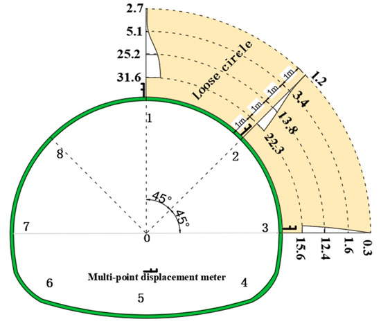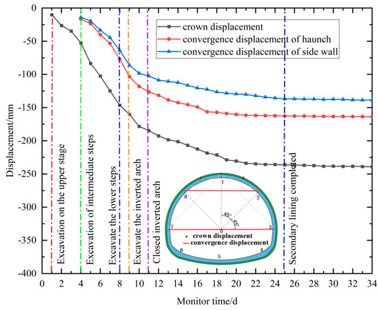 Monitoring and analysis of radial displacement and convergence deformation in the surrounding rock near the tunnel are crucial for determining the scope of excavation-induced disturbance and loosening, reasonably predicting excavation deformation, and ensuring the stability of the tunnel’s surrounding rock and construction safety. Therefore, monitoring radial displacement and convergence deformation in the surrounding rock can effectively guide and optimize the length of excavation benches, determine the timing of lining support, reasonably predict the reserved deformation of the surrounding rock, and provide important guidance for controlling over-excavation and achieving engineering economy and safety.