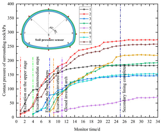 Figure 14 indicates that, influenced by the excavation space and time effect, before the closure of the inverted arch (from the excavation of the upper bench to the closure), the contact pressure on the surrounding rock at the measurement points of the arch crown, arch waist, and sidewall accounts for 61–81% of the total contact pressure; the contact pressure at the measurement points of the arch foot and inverted arch accounts for 34–47% of the total. From the closure of the inverted arch to before the construction of the secondary lining, the contact pressure at the measurement points of the arch crown, arch waist, and sidewall accounts for 11–28% of the total; the contact pressure at the measurement points of the arch foot and inverted arch accounts for 37–73% of the total. After the construction of the secondary lining, the contact pressure at the measurement points of the arch crown, arch waist, and sidewall accounts for 7–10% of the total; the contact pressure at the measurement points of the arch foot and inverted arch accounts for 11–29% of the total. After the construction of the secondary lining, except for the inverted arch, the contact pressure at other measurement points accounts for 7–19% of the total contact pressure, while the contact pressure at the inverted arch measurement points accounts for 29% of the total. The monitoring results are generally consistent with the findings in reference [47], which obtained a load-sharing ratio for the secondary lining between 8 and 13% using a reasonable ratio calculation method for vertical and horizontal rock pressures. Compared with other measurement points, the contact pressure at the inverted arch accounts for a relatively larger proportion after the construction of the secondary lining. This is because after the closure of the inverted arch, with the improvement of the bearing capacity of the base reinforced by the rotary jet pile, the resistance to deformation of the primary support is enhanced, and the contact and extrusion between them are evident. After the secondary lining is closed to form a ring, the contact pressure of the surrounding rock is readjusted. Coupled with the self-weight load of the secondary lining acting on the inverted arch, the contact pressure at this stage accounts for a relatively large proportion, which also verifies that the design of the secondary lining for loess tunnels needs to bear part of the load.