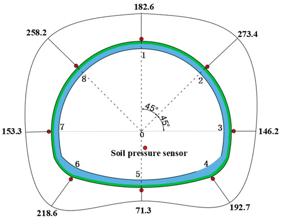 Based on the statistical analysis of data collected from the earth pressure cells (WC1-8) at the monitoring section, the time-history curve of contact pressure between the surrounding rock and the primary support, as well as the distribution map of this contact pressure, are shown in Figure 12 and Figure 13, respectively. As can be seen from these figures, the contact pressure between the surrounding rock and the primary support at various measurement points exhibits the same temporal characteristics, showing a nonlinear increase with time and the expansion of excavation space. After the inverted arch is closed, the pressure increases slowly, and it basically stabilizes after the construction of the secondary lining. The distribution of contact pressure on the entire section roughly forms a symmetrical “four-corner” pattern. The contact pressures of the surrounding rock at the left and right arch waists (upper bench arch feet) are 258.2 kPa and 273.4 kPa, respectively, while those at the left and right arch feet are 218.6 kPa and 192.7 kPa, respectively. Overall, the contact pressure is greater at the arch than at the sidewall and the smallest at the inverted arch. The contact pressure of the tunnel passing through soft plastic loess exhibits the following patterns: Under the same burial depth, the contact pressure of soft plastic Class VI surrounding rock is larger than that of general Class IV and V surrounding rocks, and there is unevenness. The contact pressure distribution of soft plastic Class VI surrounding rock forms a “four-corner” pattern, while that of Class IV and V surrounding rocks mostly forms a “cat’s ear” pattern. The existence of soft plastic loess greatly increases the rock pressure borne by the primary support. Considering the moisture content of the surrounding rock near the tunnel and the changes in displacement around the tunnel, after the excavation of the middle bench, the moisture content of the surrounding rock at the arch waist (upper bench arch foot) reaches the maximum, and after the excavation of the lower bench, the moisture content at the arch foot reaches the maximum. Due to the migration of moisture in the surrounding rock towards the free face, water accumulation at the arch foot leads to the softening of the surrounding rock. The surrounding rock at the arch foot exerts extrusion on the tunnel wall, causing convergence deformation of the primary support and resulting in an increase in contact pressure. The deformation of the surrounding rock and the changes in contact pressure further indicate that in tunnel lining and support construction, it is essential to strengthen the support at the arch foot to provide sufficient resistance against the deformation of the surrounding rock. This is crucial for ensuring the stability of the surrounding rock and construction safety and should be given attention.