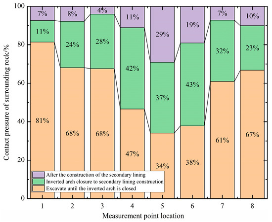Taking the closure of the inverted arch as the time node, the development of contact pressure on the surrounding rock can be divided into two stages: from the excavation of the upper bench to the closure of the inverted arch and from the closure of the inverted arch to the construction of the secondary lining. The stacked bar chart showing the percentage of contact pressure at each measurement point relative to the total pressure is presented in Figure 14.