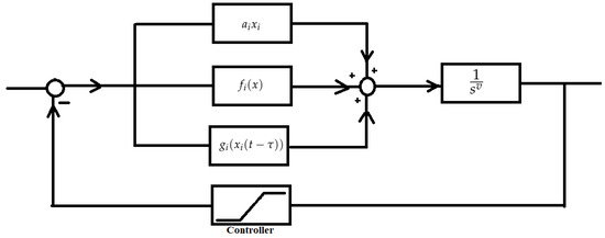 Let and denote the state and input vectors, respectively, where and represent the state and input. The functions and correspond to the linear or nonlinear components of the system. Here, N denotes the number of states, represents the time delay, and is the saturation function that constrains the input control, defined as , where is the saturation bound. Additionally, and are specific real constants, and it is assumed that the system is controllable. Figure 1 presents a detailed block diagram of the system under consideration, providing a clear visualization of its structure and functionality.