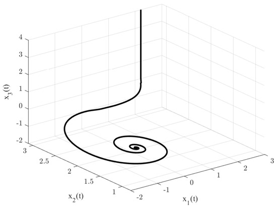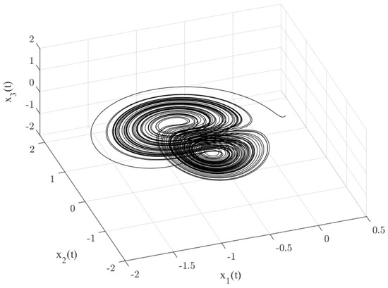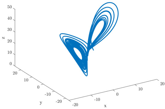 In this section, we extend the application of our proposed control approach to the FO Liu system. By incorporating time delays, we aim to further validate the effectiveness and applicability of our control methods across different chaotic systems. We begin by transforming the traditional FO Liu system into a form that incorporates multiple time delays [29], as represented in Equation (51). The system dynamics are governed by three state variables , , and , with corresponding fractional derivatives in the Caputo sense denoted by . The system coefficients a, b, c, and d are predefined constants, while represents the time delay. We select specific coefficient values (, , , ) and an initial condition of to simulate the FO Liu system without control. The phase plot of the system is presented in Figure 6.