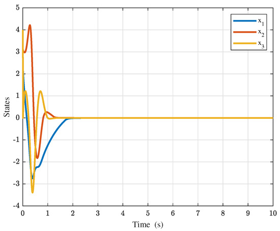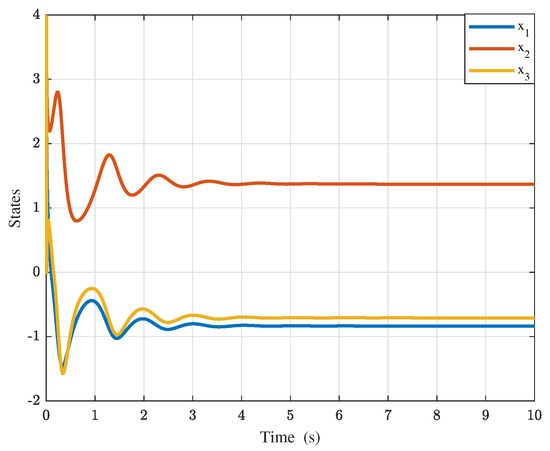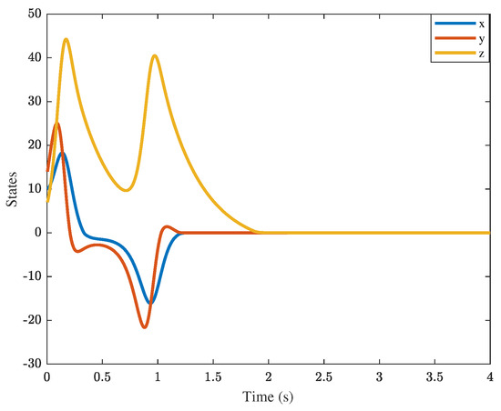 It is evident that the matrix W is an M-matrix. We now proceed to analyze the closed-loop system described by (53) with the proposed controller. The time responses of the controlled FO Liu system are illustrated in Figure 7 and Figure 8, showcasing the system’s behavior under the influence of the designed controller. These figures provide insights into the convergence speed and stability of the controlled system. Figure 9 depicts the output of the saturation control.