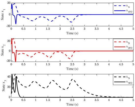 Time evolution of state variables of the closed-loop FO Liu system for .