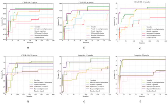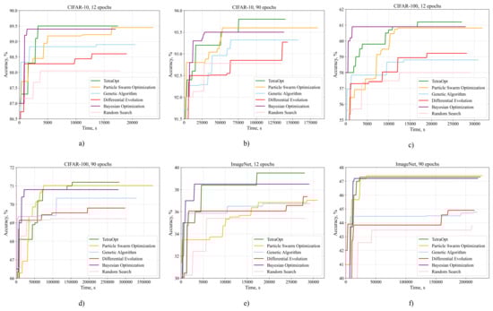 For the evaluation of TetraOpt for HPO in convolutional neural networks, we used NATS-Bench [] (Neural Architecture Transferability and Search Benchmark)—a comprehensive benchmark for HPO for image classification tasks. To provide a comparative analysis, along with TetraOpt, we evaluated the performance of other algorithms for HPO in neural networks: Bayesian Optimization [], Particle Swarm Optimization (PSO) [], Differential Evolution (DE) [], the Genetic Algorithm [], and Random Search [].