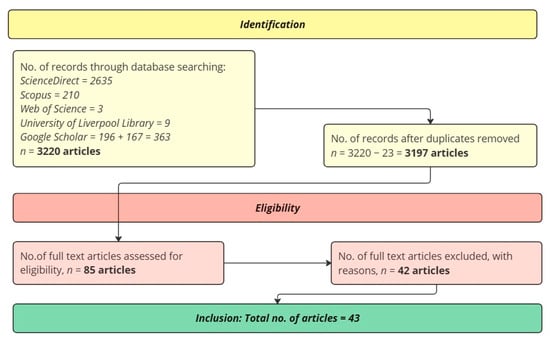 A literature search was conducted across several databases, including SCOPUS, Web of Science, ScienceDirect, Google Scholar, and the University of Liverpool’s (UoL) Library, covering publications from 2000 to 2024. Search strings were chosen based on the key terms relevant to the research topic. Boolean operators and database-specific field tags were used to ensure consistent and comprehensive search. The complete search strings for each database are provided in Table S1 in the Supplementary Materials.