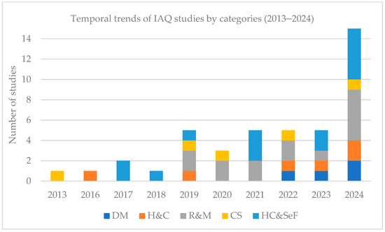 The temporal patterns of the IAQ studies, listed in Table 2, over the period 2013–2024 are shown in Figure 2. IAQ research has steadily increased over time, with notable growth observed in 2024, showing a heightened global focus on IAQ in social housing, particularly in LMICs. The themes of R&M and HC&SeFs accounted for significant contributions in 2024, highlighting the growing interest in architectural and behavioral interventions. However, CS remains underrepresented throughout the timeline, suggesting a need for more cross-regional- and/or cross-housing-type analyses to better understand the structural and environmental factors influencing IAQ.