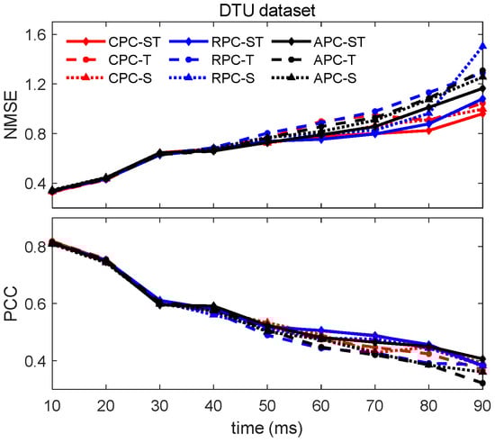NMSE and PCC over time across different coupling structures for the DTU dataset.
