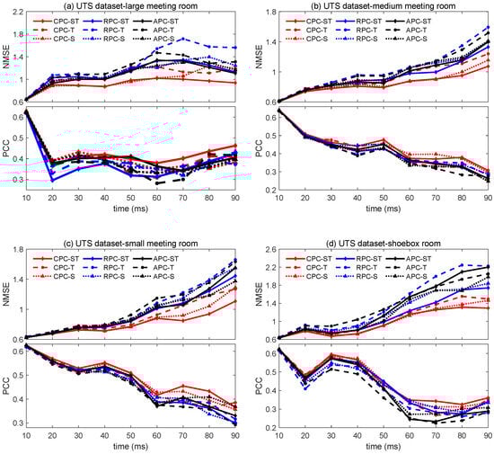 NMSE and PCC over time across different coupling structures for the UTS dataset: (a) large meeting room, (b) medium meeting room, (c) small meeting room, and (d) shoebox room.