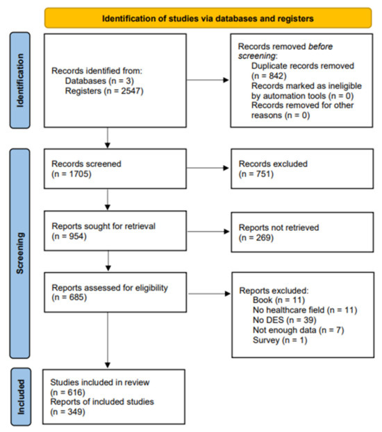 The included studies focused on discrete-event simulation applications in healthcare settings, specifically in hospitals. Studies were required to be written in English, published in peer-reviewed journals between January 2010 and December 2022, and contain a digital object identifier (DOI). The studies needed to demonstrate practical applications of DES in healthcare environments, including patient flow analysis, resource management, or process improvement initiatives. Conference proceedings, book series, articles without abstracts, and retracted publications were excluded from the analysis.