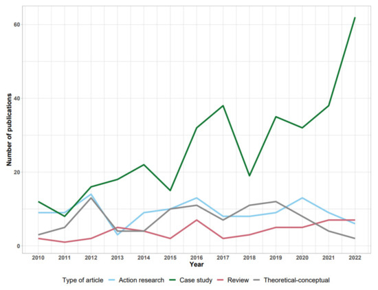 The final analysis included 616 publications, comprising case studies, action research, reviews, and theoretical–conceptual papers. From these, 349 publications were identified as case studies and were selected for detailed analysis. The present article focuses exclusively on these case studies, examining their methodological approaches, implementation contexts, and reported outcomes in healthcare settings.
