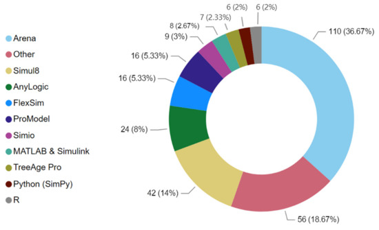 Interestingly, our analysis identified several comparative studies where multiple software platforms were used within the same case study [21,22,23,24,25,26,27]. This trend of software comparison reflects a growing sophistication in the healthcare simulation community, where practitioners are increasingly focused on identifying the most appropriate tools for specific contexts. The fact that the sum of software implementations exceeds the 349 analyzed case studies due to these comparative studies suggests a methodological maturity in the field, where researchers are actively evaluating and comparing different simulation approaches.