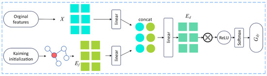 As the relationships between features may change with varying input data, the Flow-aware dynamic graph learning method is proposed to establish a connection between the generated graph and real-time data. As shown in Figure 2, at first, an initial adjacency matrix is generated using Kaiming initialization to represent the relationships among features. Then, two linear transformation layers are designed to separately transform the real-time data input X and the adjacency matrix Ef. The transformed vectors are subsequently concatenated and subjected to an additional linear transformation, resulting in a new embedding, Ed. The transformation process can be expressed by the following formula:
