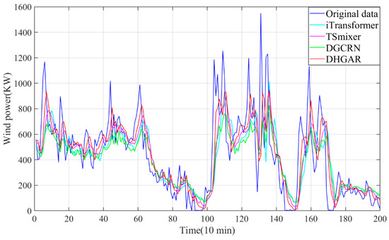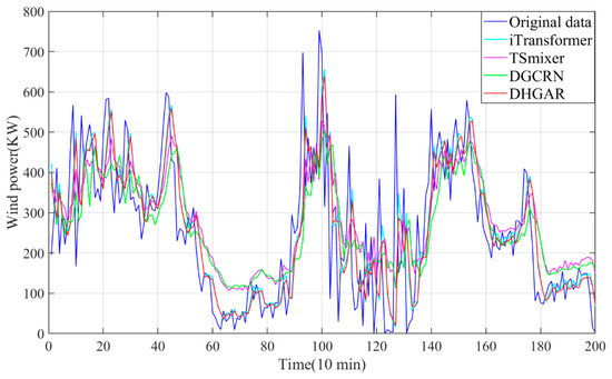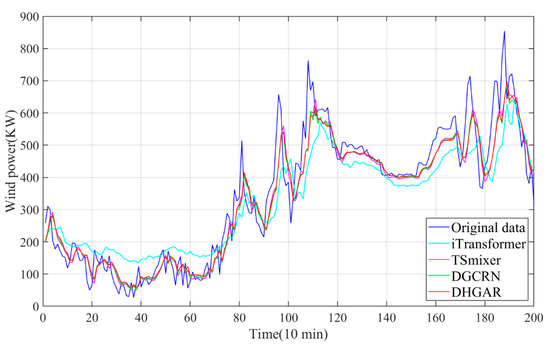 Table 2 shows the experimental results of the proposed model and all baselines on three datasets. Table 3 shows the training time of the proposed model and several baselines. Based on the experimental results, it can be seen that DHGAR can achieve the best experimental results on all the datasets. In addition, to directly demonstrate the forecasting performance of the proposed model, this section visualizes the forecasting results of the proposed model and several baselines. Figure 5, Figure 6 and Figure 7 show the visualizations on all datasets. Based on Table 2 and Table 3 and Figure 5, Figure 6 and Figure 7, the following conclusions can be drawn: