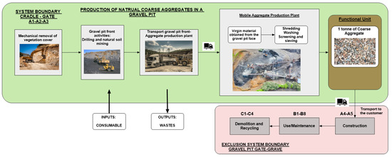 The first stage of production (A1–A3) corresponds to the activities necessary to produce the materials that make up a building/work [1]. The construction and commissioning stage (A4–A5) characterizes the processes of implementation of the previously manufactured materials in the building. Subsequent stages such as use and maintenance (B1–B8) cover the processes that are necessary and arise in the process of the building’s service life. Finally, the last stage, known as end of life (C1–C4), encompasses the activities of disposal, demolition and management of building waste. Considering the main objective of the research project, namely the production of natural aggregates that can be used in the future in the construction sector, the scope is limited only to the first stage, that is the raw material production stage such as natural aggregates. This first stage consists of the internal processes such as the extraction of raw materials (A1), their transport to the processing site (A2) and finally the manufacturing process until the desired material/product is produced (A3). It is therefore justified that in the specific case of the research project, the system boundaries encompassing the production of NCA in the gravel pit will be studied (see Figure 1). This system boundary is referred to in the cradle-to-gate LCA methodology and its use is in line with previous research in the field [1,5,20,21].