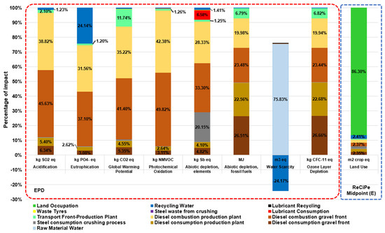 Numerical environmental results obtained for the production of 1 ton of NCA in a gravel pit, for the impact categories of the EPD methodology, plus the land use impact category of the ReCiPe methodology in its mid-point results, can be found in Table 2. Furthermore, Figure 2 shows how the processes and materials identified in the LCI contribute in percentage terms to the total impact (0–100%) in each category (value represented in Table 2). Therefore, the substances or processes that have the greatest negative impact can be easily identified and action can be taken in order to improve the environmental sustainability of the process.