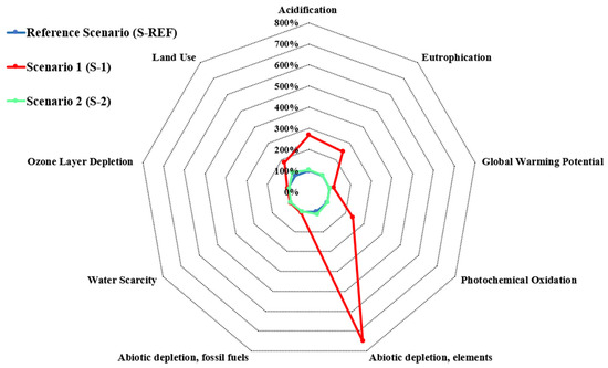 However, the S-1, in contrast to the S-REF, does show substantial differences in certain impact categories that will be discussed later, but for the categories of Water Depletion (increase of 2.04%), Abiotic Depletion of Fossil Fuels (increase of 5.68%) and Ozone Depletion (increase of 3.17%), the increases are insignificant compared to the S-REF. However, in other categories such as Acidification (168.58% increase), Eutrophication (149.73% increase), Photochemical Oxidation (140.10% increase), Abiotic Depletion of Elements (649.69% increase), and land use (80.91% increase), the increases are exponential with respect to the S-REF. The use of explosive material as an element to produce mechanical breakage of the soil and obtain virgin material for subsequent treatment implies the emission of large quantities of substances such as ammonia and NOX emissions and volatile compounds that directly affect the categories highlighted above [31]. This is identified by previous authors such as Anne de Bortoli, where she indicates that the use of explosives for the production of natural aggregates can contribute to impact categories ranging from 18% to 86% [22]. However, the highest exponential result obtained is in the category of Depletion of Abiotic Elements, according to Rosado et al.’s research, because the production of explosive material involves the use of aluminum that must be directly extracted from nature, impacting considerably on this impact category [5]. The results of S-1 lead to the conclusion that the environmental impacts associated with the production of NAs is highly variable and will depend on many factors such as the technology used and whether extraction by explosives, etc., is necessary. This is in addition to an important aspect such as the natural origin of the type of NAs, as depending on the type and nature of the rock, there can be variations between a 13% and 49% increase or decrease in impact [22].